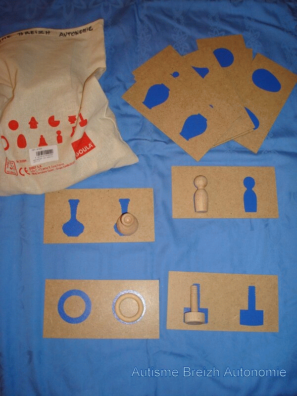 Choisissez une carte en bois et tentez de retrouver la forme représentée dans le sac. 2 pièces à retrouver pour chaque carte. Formes simples à plus complexes et détaillées. Ce jeu permet de travailler la discrimination tactile, la concentration et l’association des sens vue-toucher. Il faut « explorer » les pièces en bois du bout de ses doigts pour en identifier la forme.