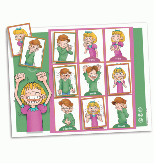 Cet ensemble "4 jeux en 1" (jeu de mémoire, jeu de loto, jeu des paires et jeu de bingo) permet d'apprendre à reconnaître les expressions faciales et à produire les termes liés aux émotions.