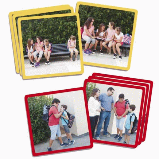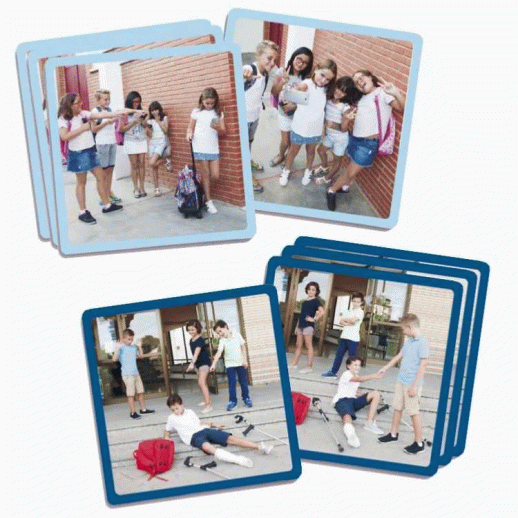 5 X 4 fiches comportant une photo de situation de harcèlement entre camarades (11,5 X 11,5 cm).