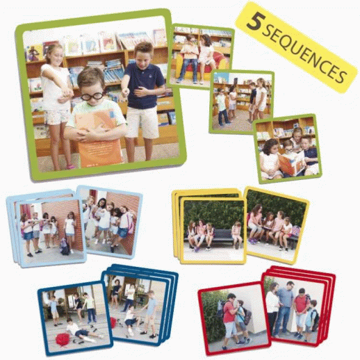 Jeu pédagogique composé de 5 séquences de 4 fiches illustrées représentant des situations de harcèlement entre camarades.