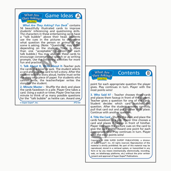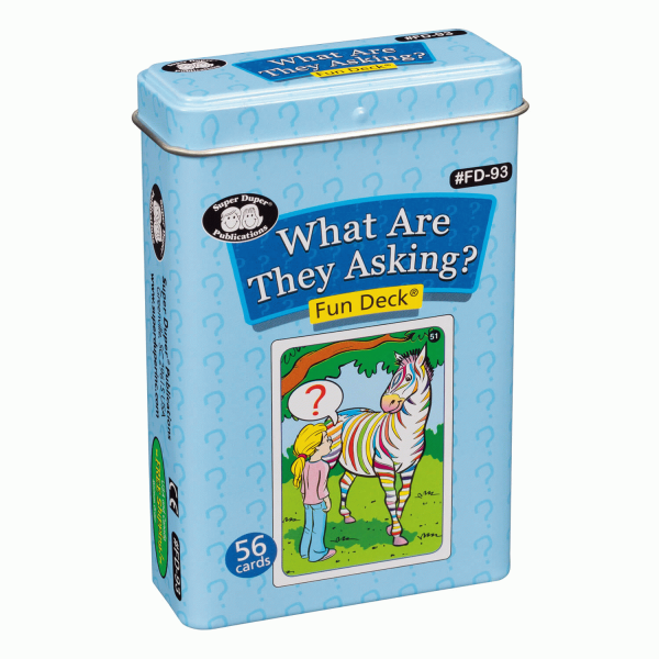 Chacune des cartes présente une situation dans laquelle un personnage pose une question… et vous décidez de ce qu’il demande ! Exercez votre créativité et vos capacités de raisonnement tout en encourageant la parole conversationnelle, ou utilisez-les comme invites d’écriture. Comprend également des idées de jeux qui stimuleront votre imagination et chatouilleront votre sens de l'humour !